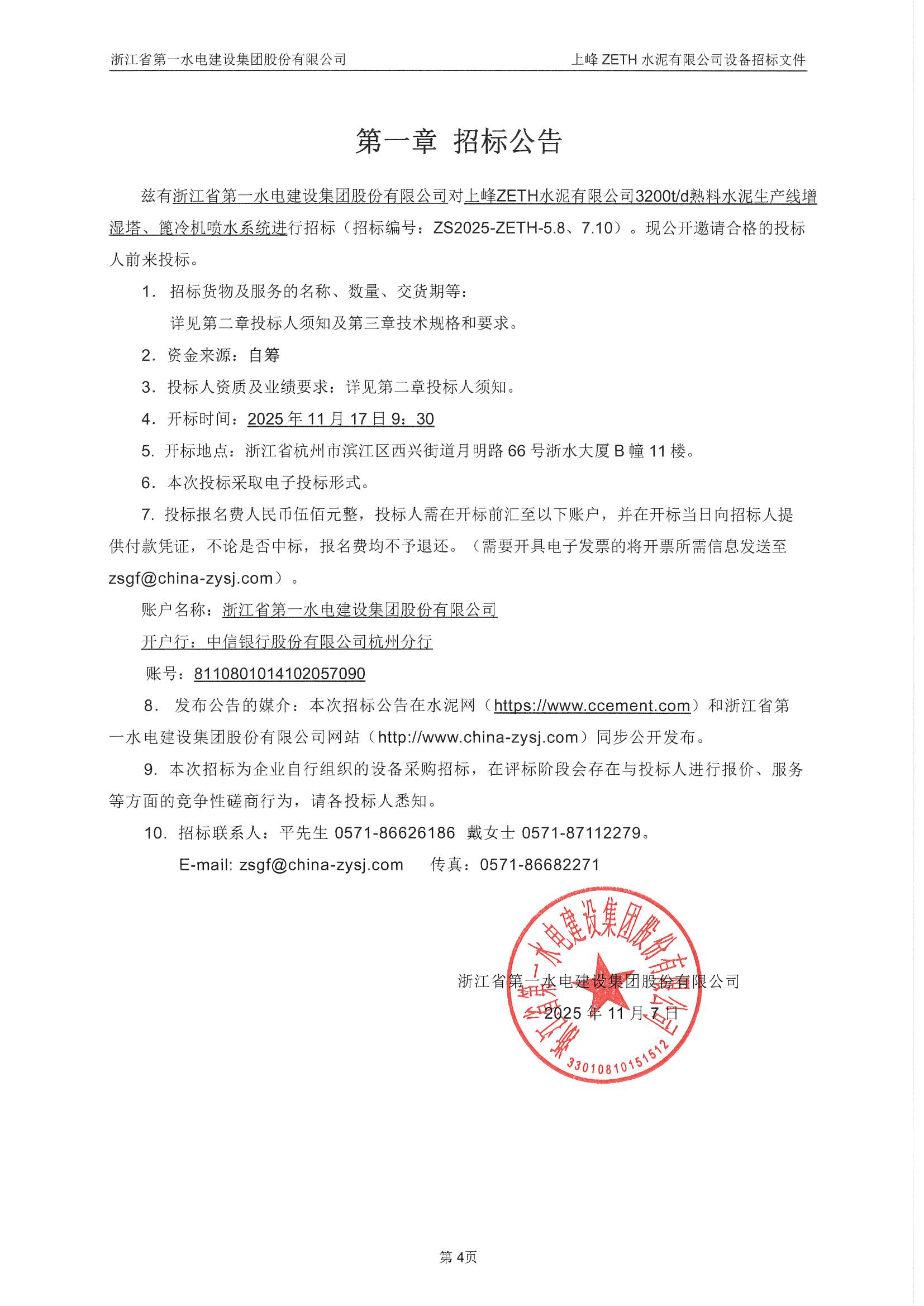 上峰ZETH水泥有限公司3200t/d熟料水泥生產(chǎn)線增濕塔、篦冷機(jī)噴水系統(tǒng)招標(biāo)公告